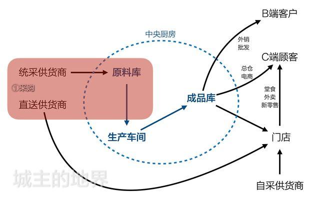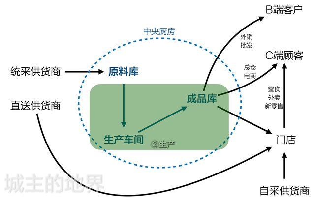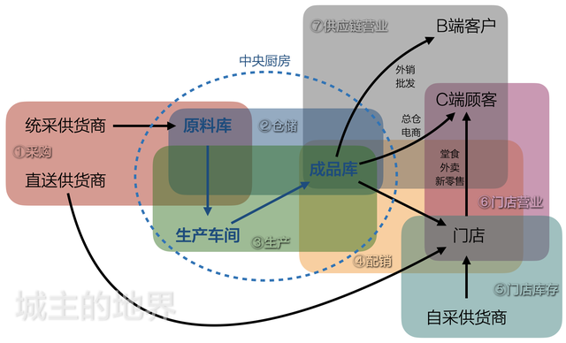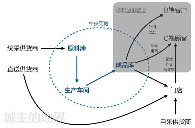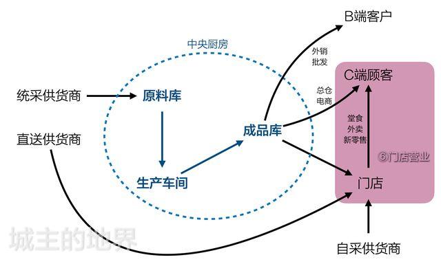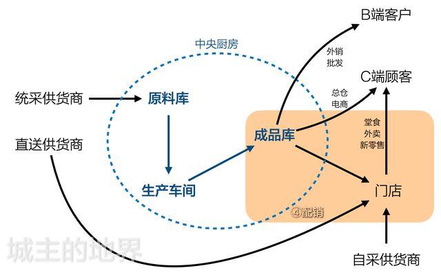 链条:中央厨房配送,供货商直送送货,门店菜品销售
