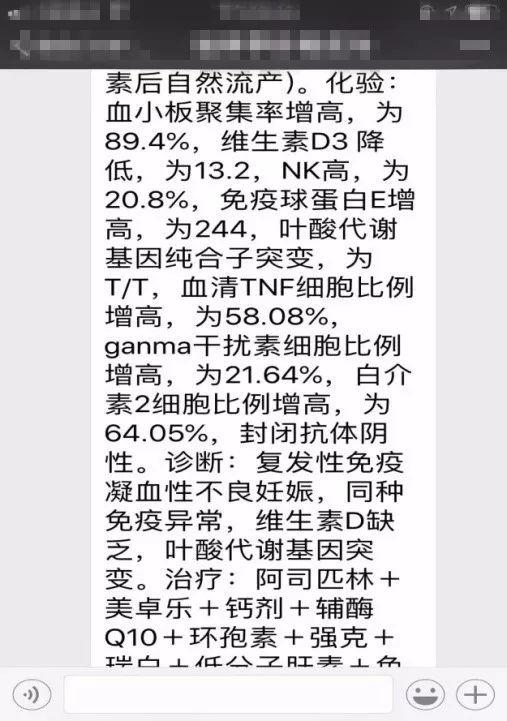 血小板聚集率增高,为89.4%,维生素D3 降低,为13.2,NK高,为20.8%,免疫球蛋白E增高,为244,叶酸代谢基因纯合子突变,为T/T,血清TNF细胞比例增高,为58.08%,ganma干扰素细胞比例增高,为21.64%,白介素2细胞比例增高,为64.05%,封闭抗体阴性。诊断:复发性免疫凝血性不良妊娠,同种免疫异常,维生素D缺乏,叶酸代谢基因突变。