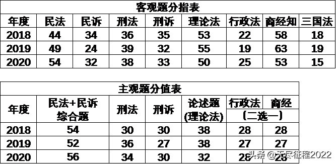 法考包括民法、民诉、刑法、刑诉、理论法、行政法、商经知、三国法8个科目,各科分值及通过率如下:
