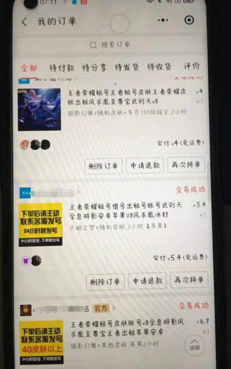 市民陈先生小孩在网店的租号记录。