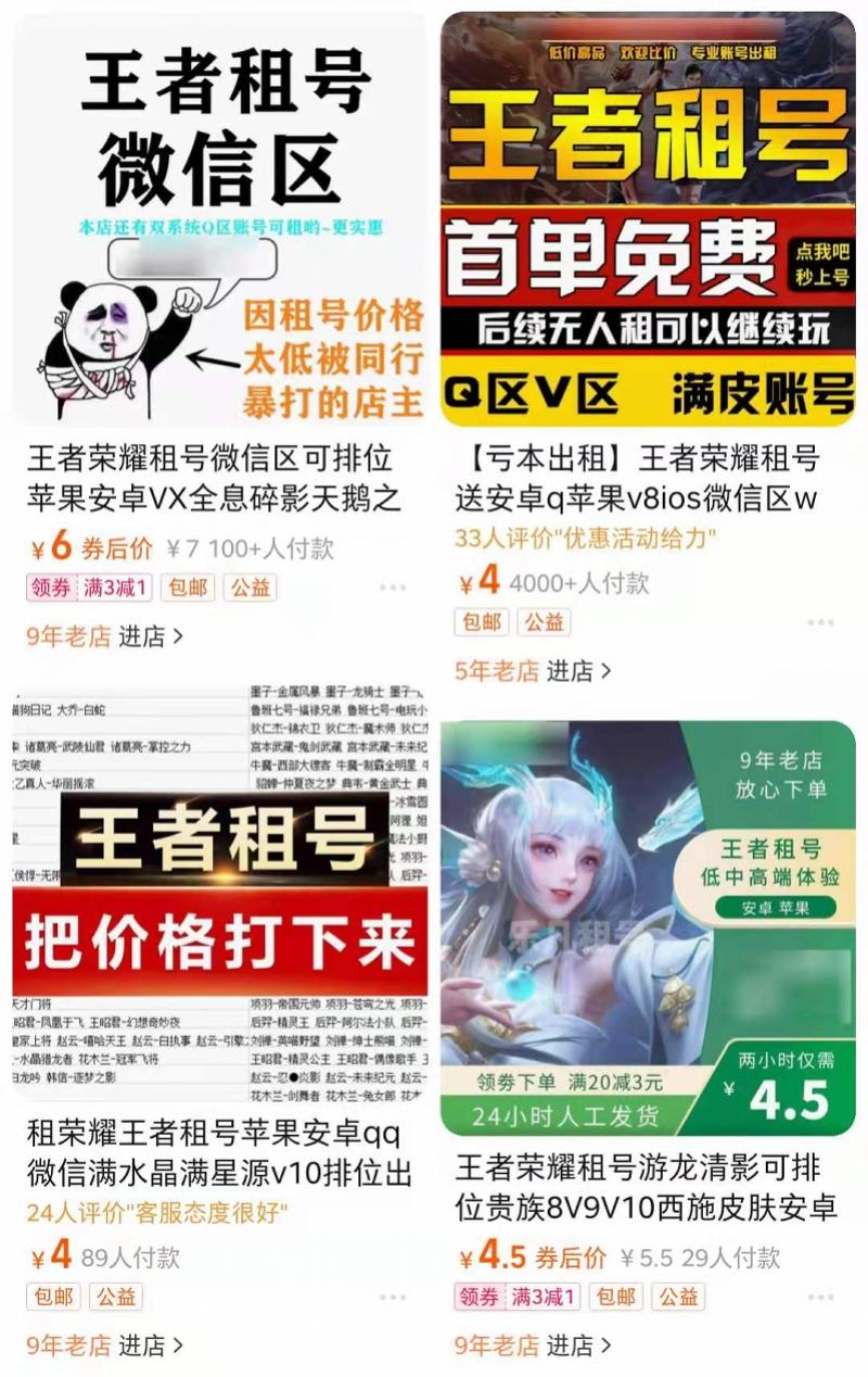 8月31日,在电商平台上有商家提供游戏租号服务。