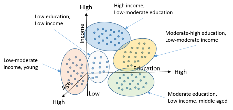 如果有一个未标记的数据集,聚类让我们来获得大量洞察力。可以使用不同的群集算法将数据自动分组到多个群集中,揭示属于特定群集的数据的共同点。如下图所示,创建了5个聚类,揭示具有不同特征的人。
