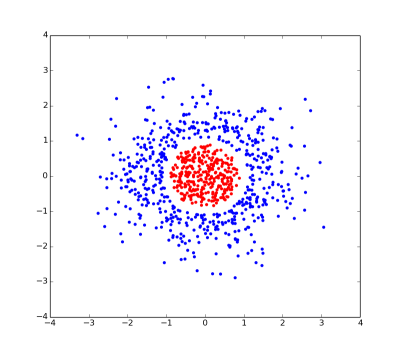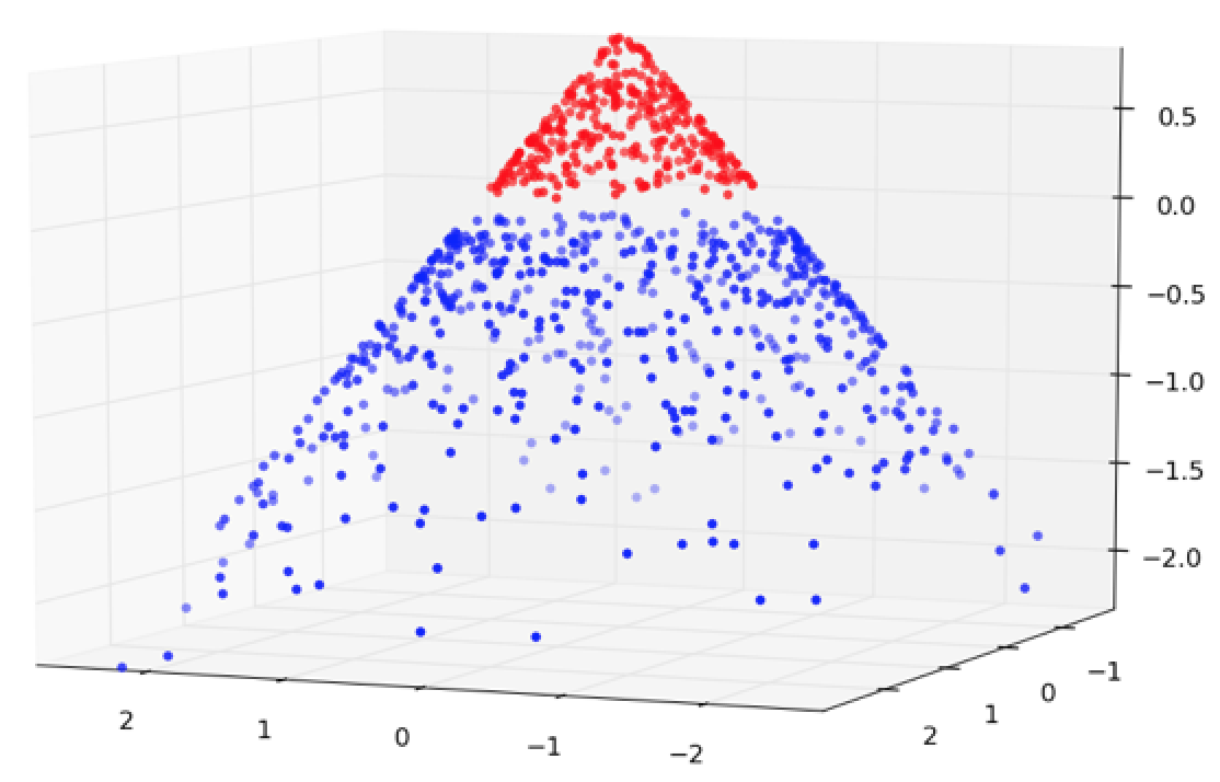 但是,如果我们给每个点一个额外的坐标比如z=1 - sqrt(x*x + y*y),那么问题就变得线性可分,因为红色和蓝色点可以通过一个二维平面z=0分开。