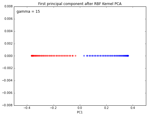 如果应用高斯核PCA,那么降维后,前两个主成分如下,显然可分。