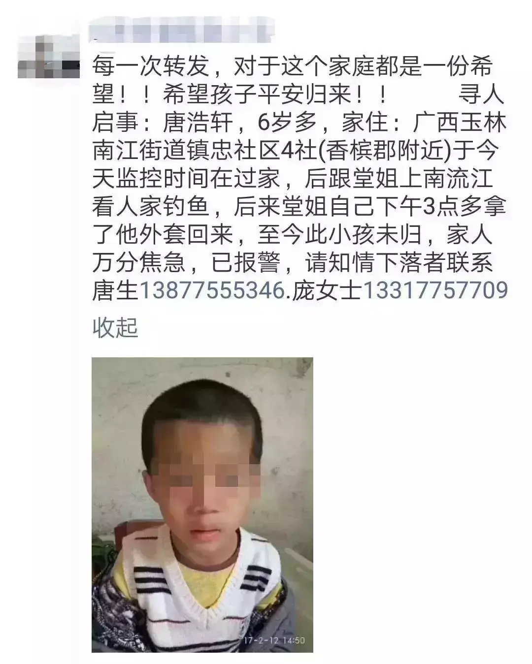 2月16日至17日,朋友圈里有一则爱心转发,其内容为玉林市玉州区南江街道镇忠社区4社一男孩与堂姐到南流江边看他人钓鱼,但后来其堂姐在16日15时许返回家中,手里拿着男孩的外套,直到当天晚上该男孩未归,家人万分焦急,随后报警,并在朋友圈寻找知情人。
