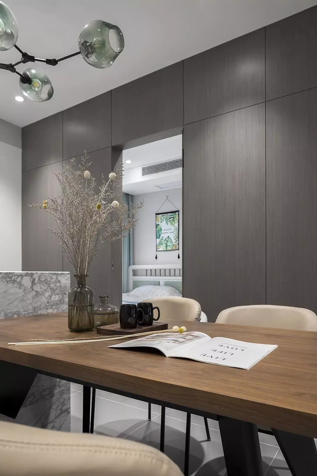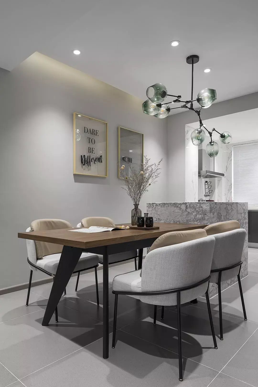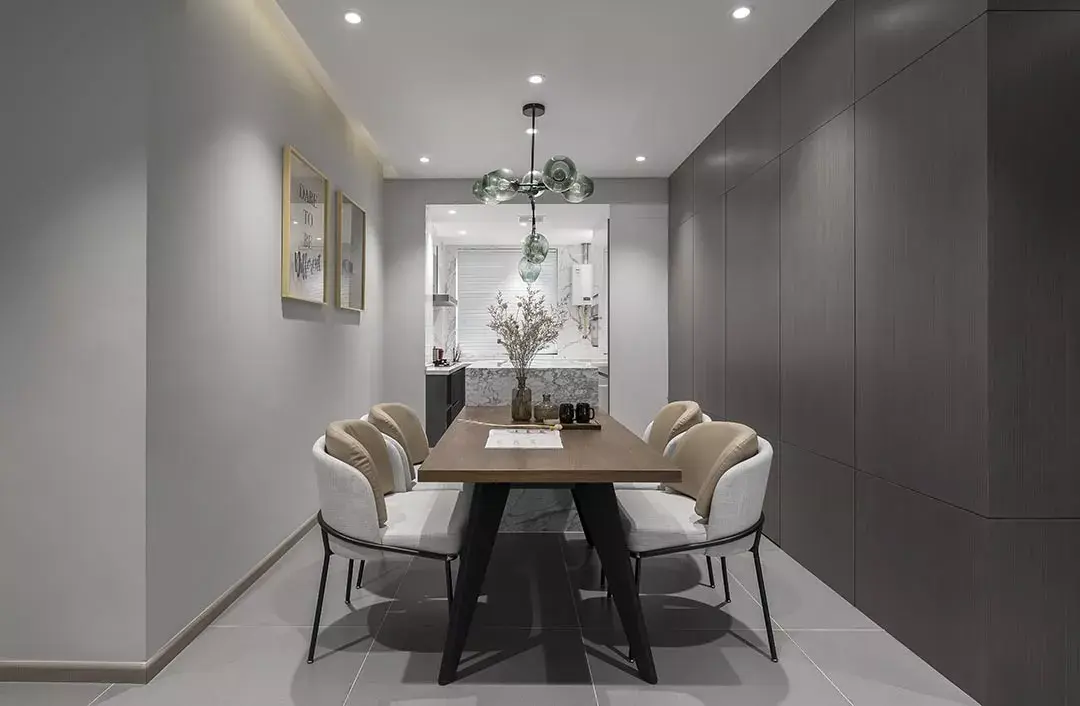 去掉繁杂、累赘、浮夸的空间线条,改追求简单、极致的设计;于是,餐厅没有雕梁画栋的布置,运用储物柜收整的墙面,搭配一盏造型吊灯、一组餐桌椅、几幅装饰画,就塑造了干净舒适的空间氛围。