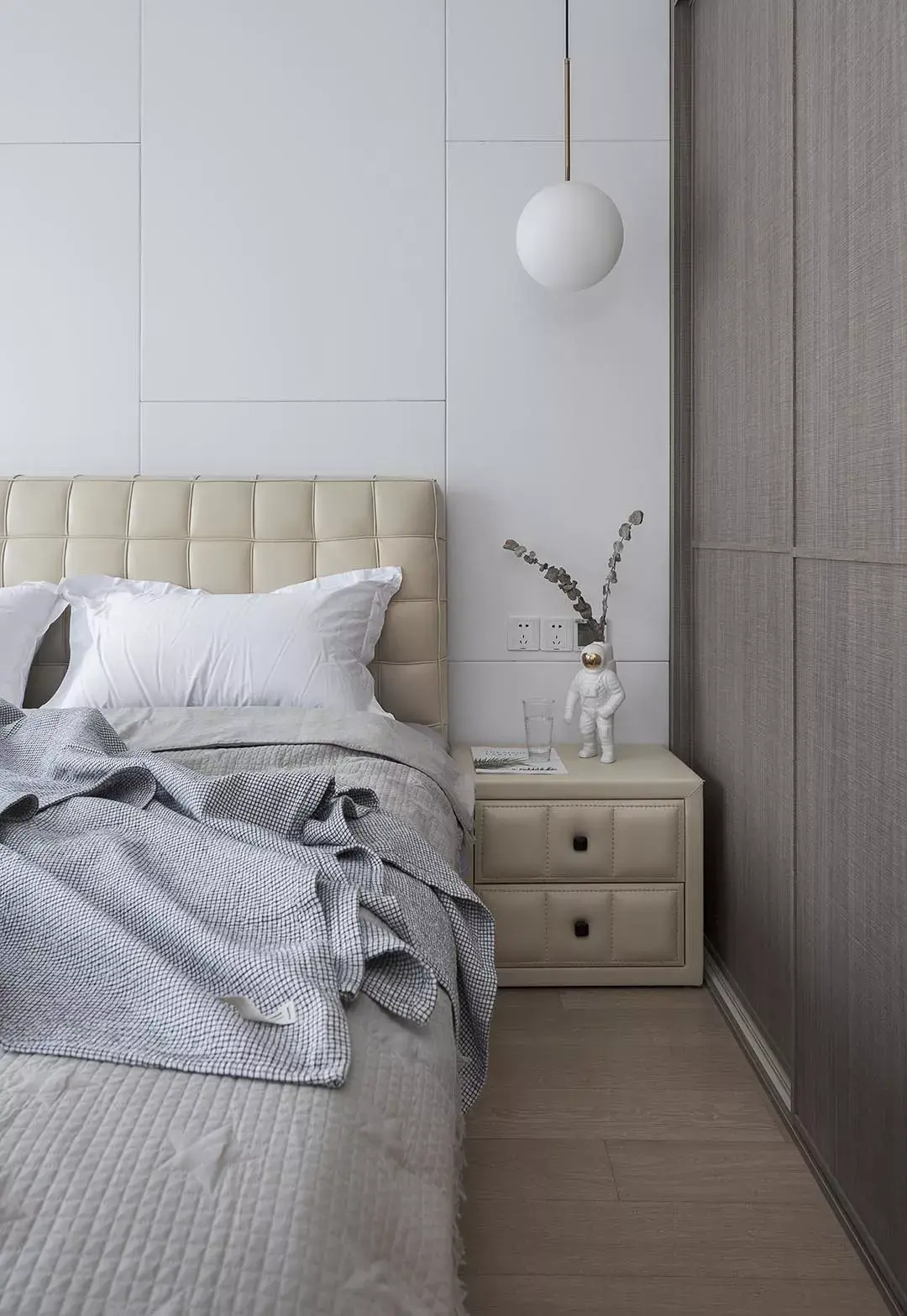 不同于公共空间的黑白灰,作为睡眠的卧室以轻浅、温暖的色调为主,并将床头板改用软性材质,搭配米色的几何图形设计,勾勒出安静、舒眠的环境。