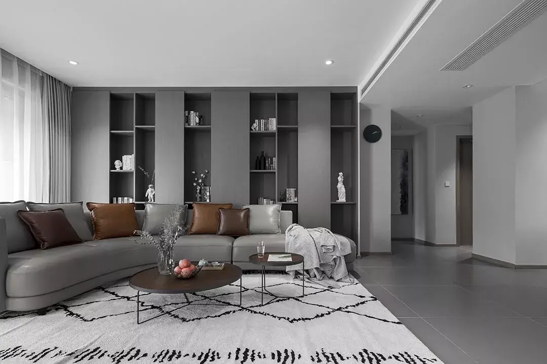 沙发背景墙则定制满墙的装饰柜,并穿插敞开、闭合的柜体设计,增添墙面的层次感,同时也能放上摆件,让整个客厅更有些玩味。