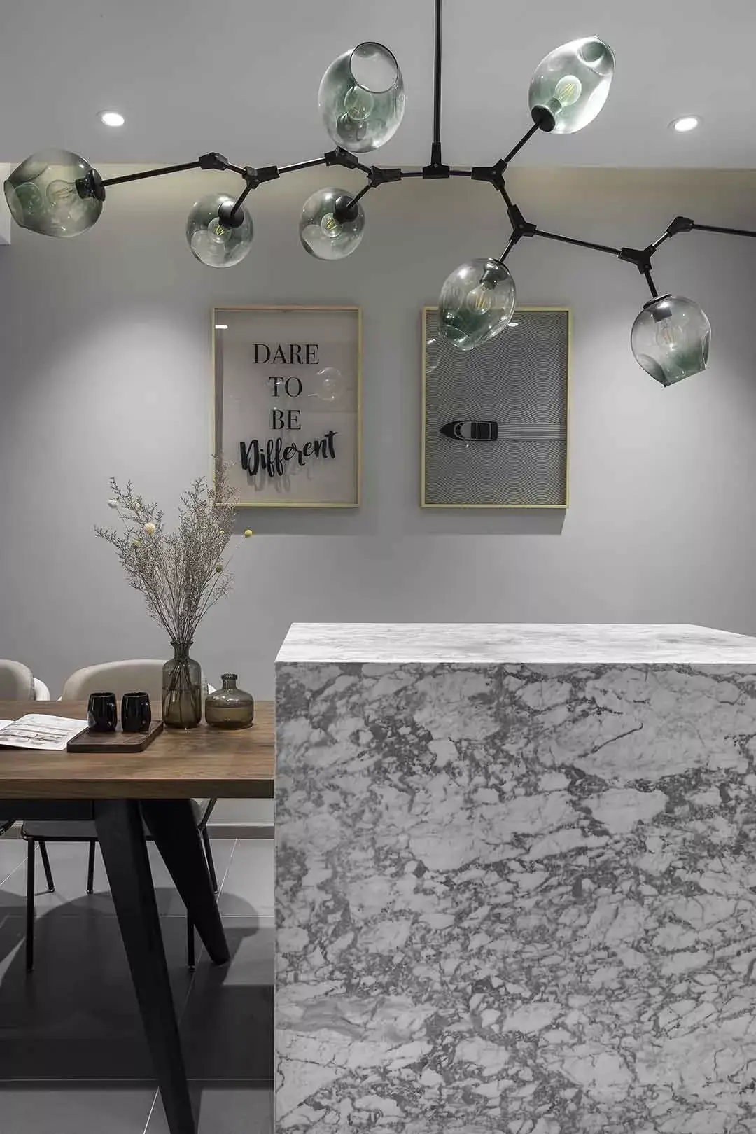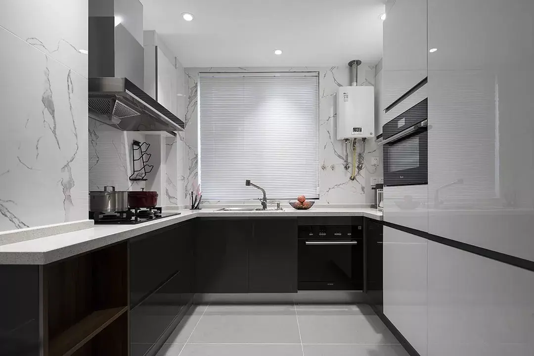 U型的厨房布局,提供最大的使用面积,并以大理石纹砖材布置墙面,为黑白灰的空间增添层次变化。