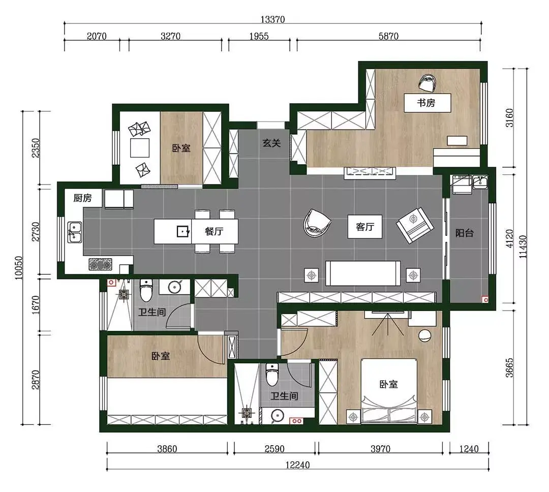 从户型图来看,原始建筑布局算方正,但公共场域的隔断略多,让客厅略显压抑,几个居室之间的交流也不足。