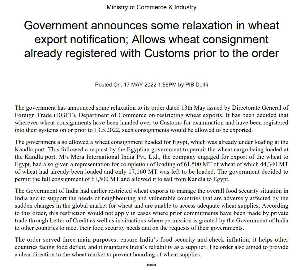 根据印度政府的文件,放宽主要体现在三方面:首先,考虑到印度对外贸易总署(DGFT)5月13日突然宣布禁止出口,所以印度政府现在同意在5月13日当天或之前,将托运小麦交由海关检查或完成系统登记的出口将被放行。