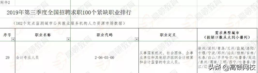 人社部公布《2019年第三季度招聘求职100个短缺职业排行》,会计从业人员排行第29名!超越了市场营销专业人员(排名第34)、人力资源管理专业人员(排名第78)等招聘热门职业!