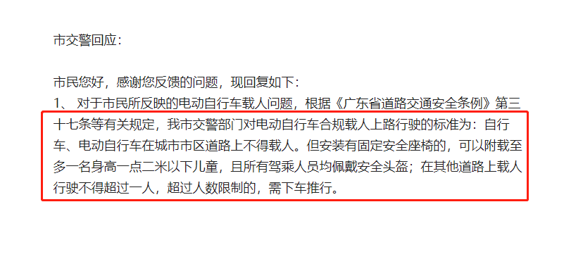 较早之前,就有网友在东莞对于交警进行咨询,为什么电动车要限制载人,而获得了交警的回应,核心原因是:根据《广东省道路交通安全条例》第三十七条等有关规定,我市交警部门对电动自行车合规载人上路行驶的标准为:自行车、电动自行车在城市市区道路上不得载人。但安装有固定安全座椅的,可以附载至多一名身高一点二米以下儿童。