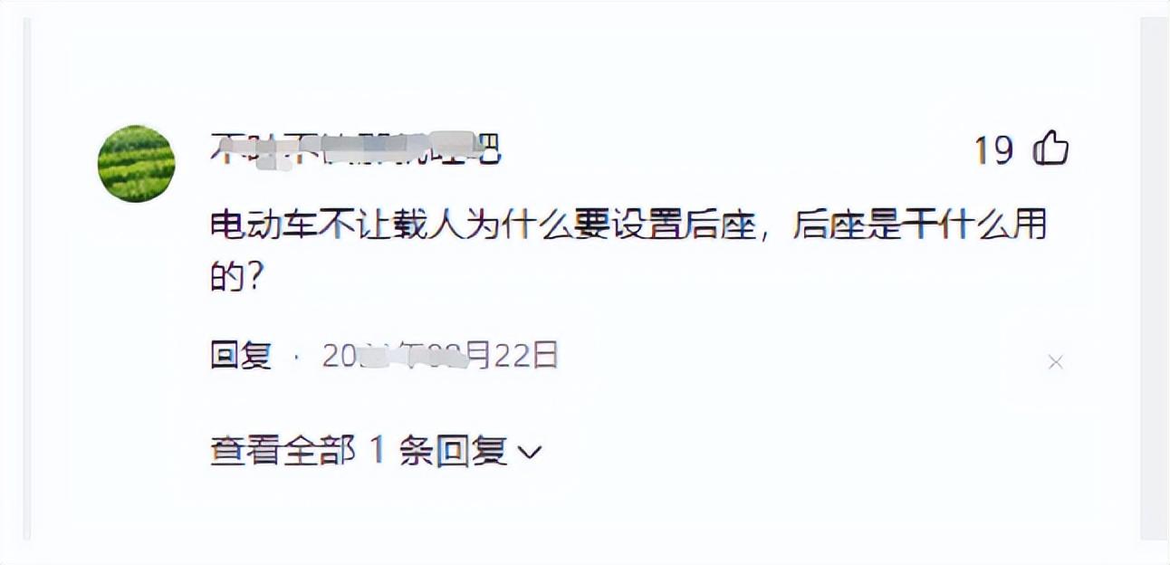 对于电动车在载人方面的设置,不少网友其实认为存在一定的不合理,甚至有网友直接表示:电动车不让载人为什么要设置后座,后座是干什么用的。