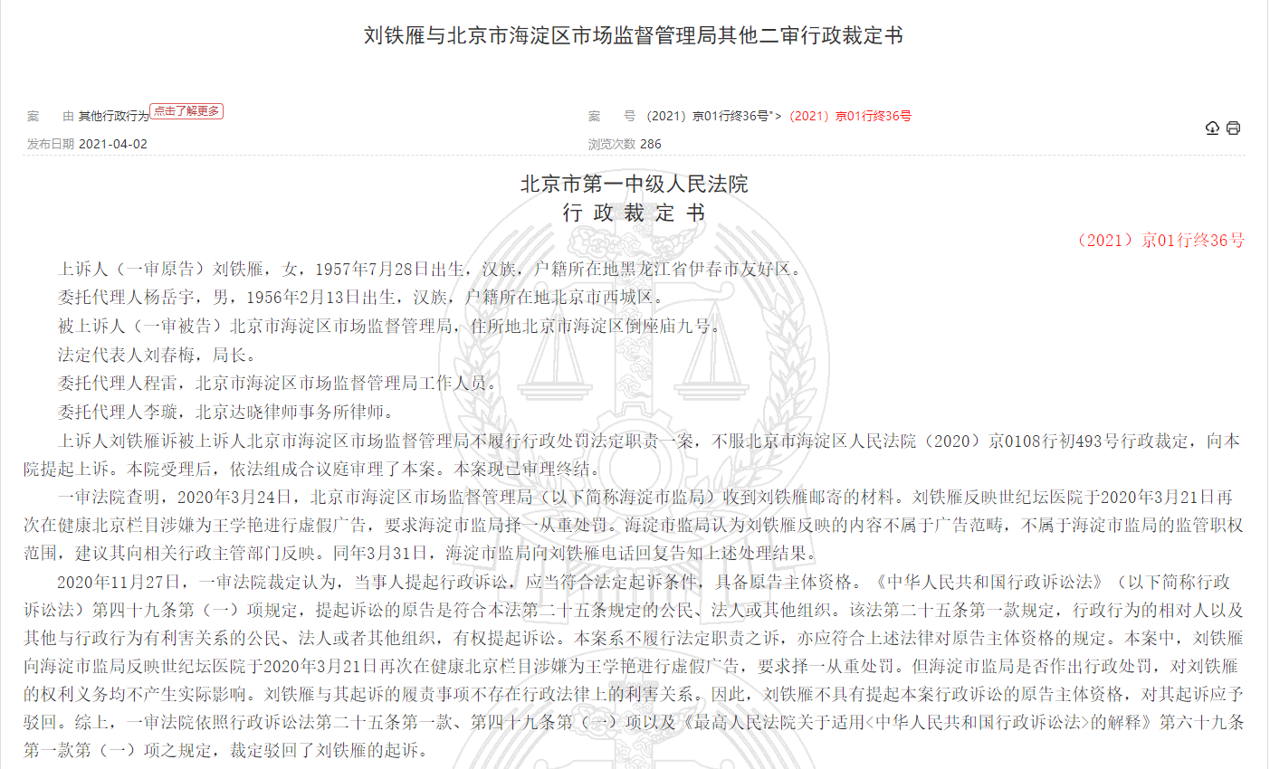 2020年3月24日,刘某某向北京市海淀区市场监督管理局反映世纪坛医院于2020年3月21日再次在健康北京栏目涉嫌为王学艳进行虚假广告,要求海淀市监局择一从重处罚。海淀市监局认为刘某某反映的内容不属于广告范畴,不属于海淀市监局的监管职权范围,建议其向相关行政主管部门反映。同年3月31日,海淀市监局向刘某某电话回复告知上述处理结果。