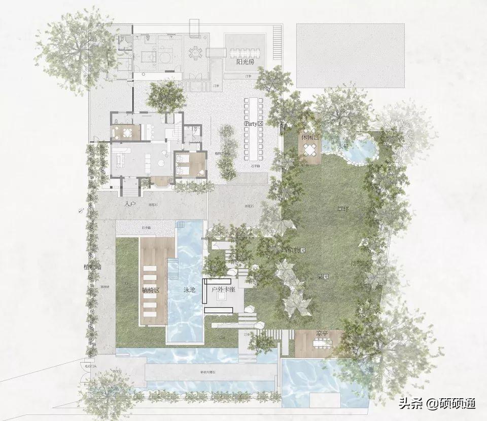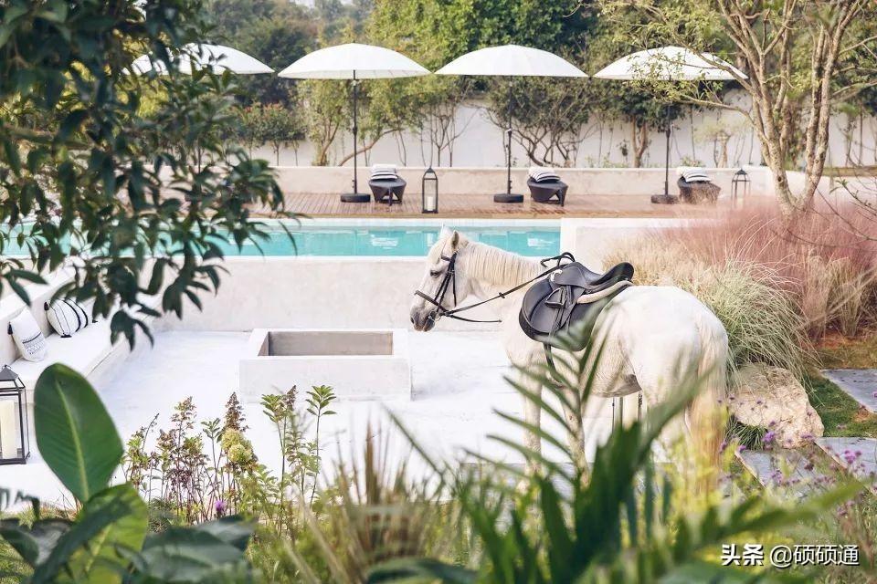 设计师在户外做了北方少有的叶子型室外泳池,与建筑风格相呼应,同时为休闲区平添一丝趣味。
