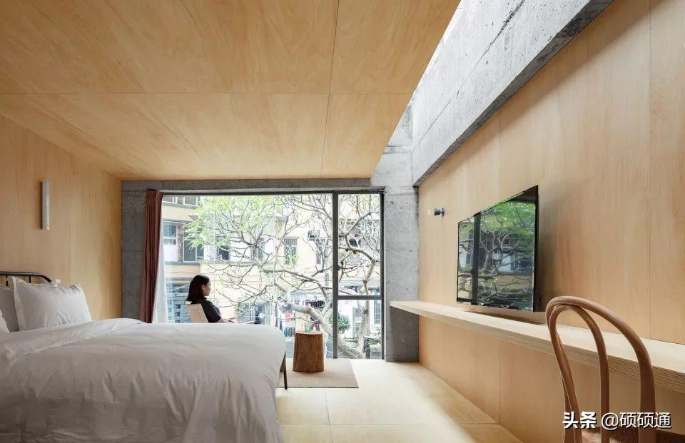室内原有梁、柱等混凝土结构干净、简单。设计师尝试将原有建筑物的混凝土结构裸露出来作为室内设计的一部分,挑选椴木胶合板作为客房室内的材料,在公共区域则使用了柳桉胶合板来突出混凝土结构。