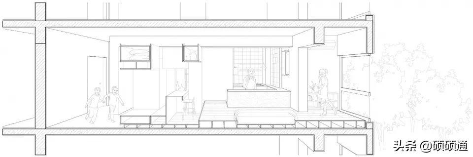 首层以上现有的承重砖墙可改动的余地不大,为了房间类型的丰富度,设计团队把中间一户均分并划到两侧,为儿童留出了半独立的卧室和玩耍空间,形成主次空间渗透的亲子居住体验。