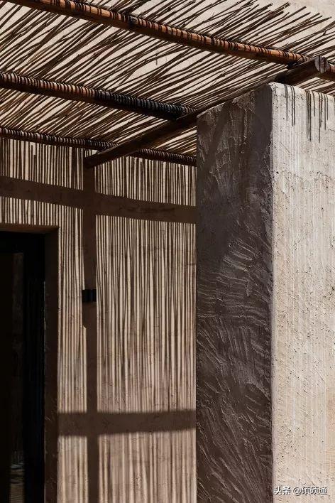 建筑基本遵循当地民居风貌,平屋、露台、院落、苇杆檐廊,将户内活动的更多可能性延伸至户外。在外墙上设计师运用了水泥砂浆抹泥的特殊工艺还原当地夯土墙的建筑肌理。从而创造了似久经风雨日照后,接近却不会崩坏的“旧”。