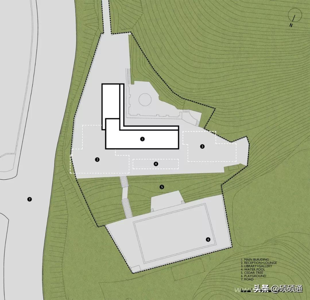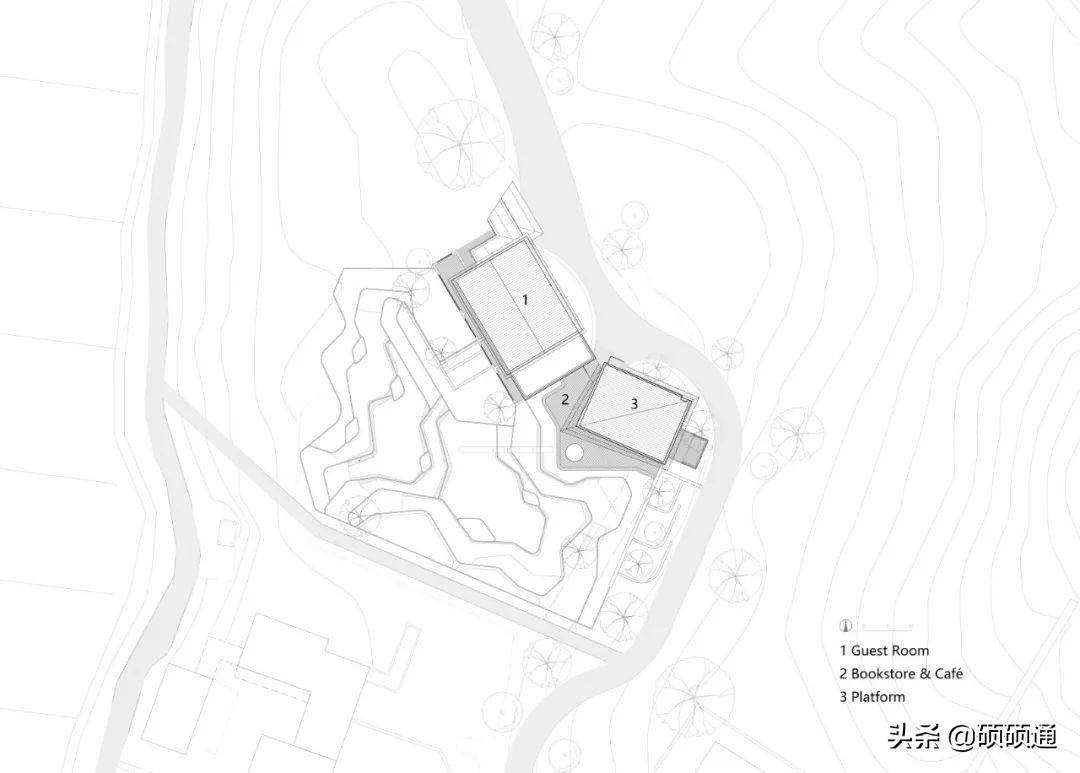 在整体规划设计中,结合场地动静分布的结构,左右两边增加两个功能,分别是酒店客厅及图书馆,而中间的主体建筑,设计则规划了25个房间的住宿功能。
