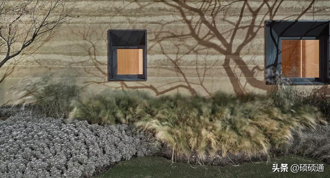 墙面材料以质朴的夯土、毛石、竹木墙板为主要基调,强调建筑的生长感和在地性。