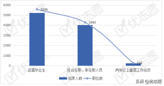 下图展示了应届毕业生、符合条件的社会在职和非在职人员、两年以上基层工作经历的人员可报考的职位情况,其中应届毕业生可报考职位数高达98.3%,部分职位仅限应届生报考,有考录公务员意愿的考生要把握应届生优势。
