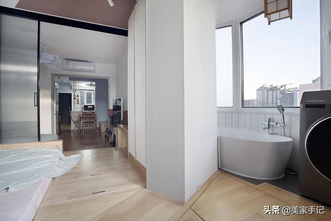 拉长视野,卧室左侧铺上了一层床垫,方便更好地休息,而右侧则是预留的过道,主要通往设置了浴缸、洗衣机,还有其它功能的阳台。
