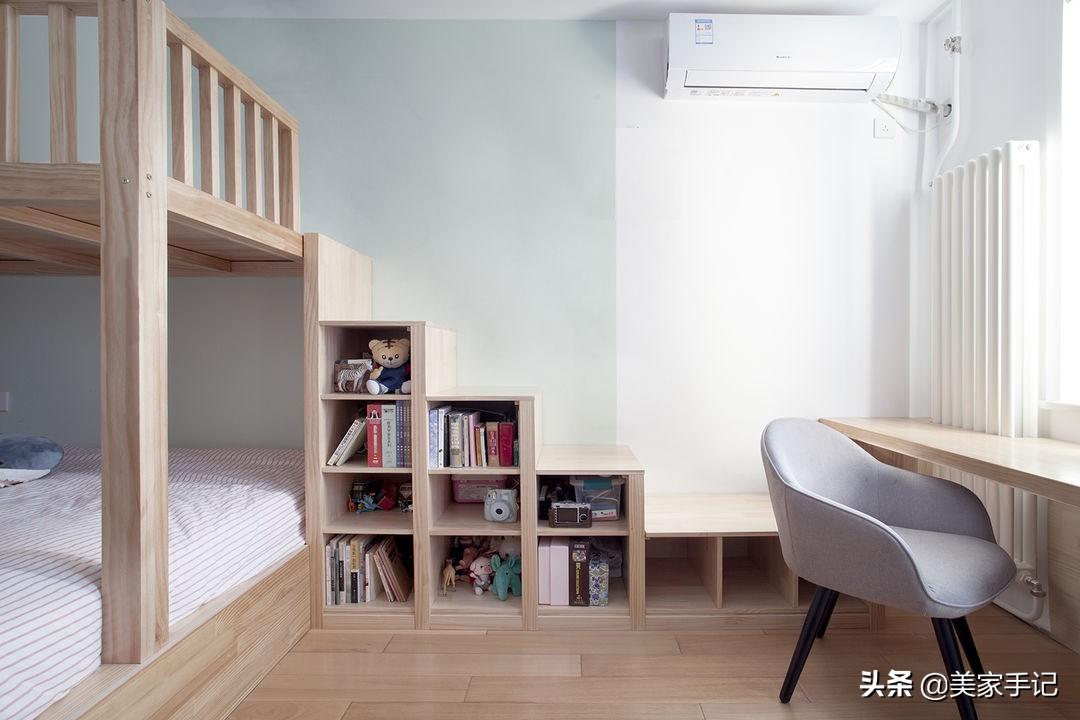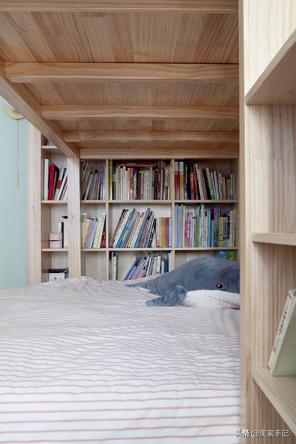 需要补充的是细节,比如靠墙卡在高低床里面的书架,以及利用楼梯增设的储物空间等等,布局都非常巧妙、实用。