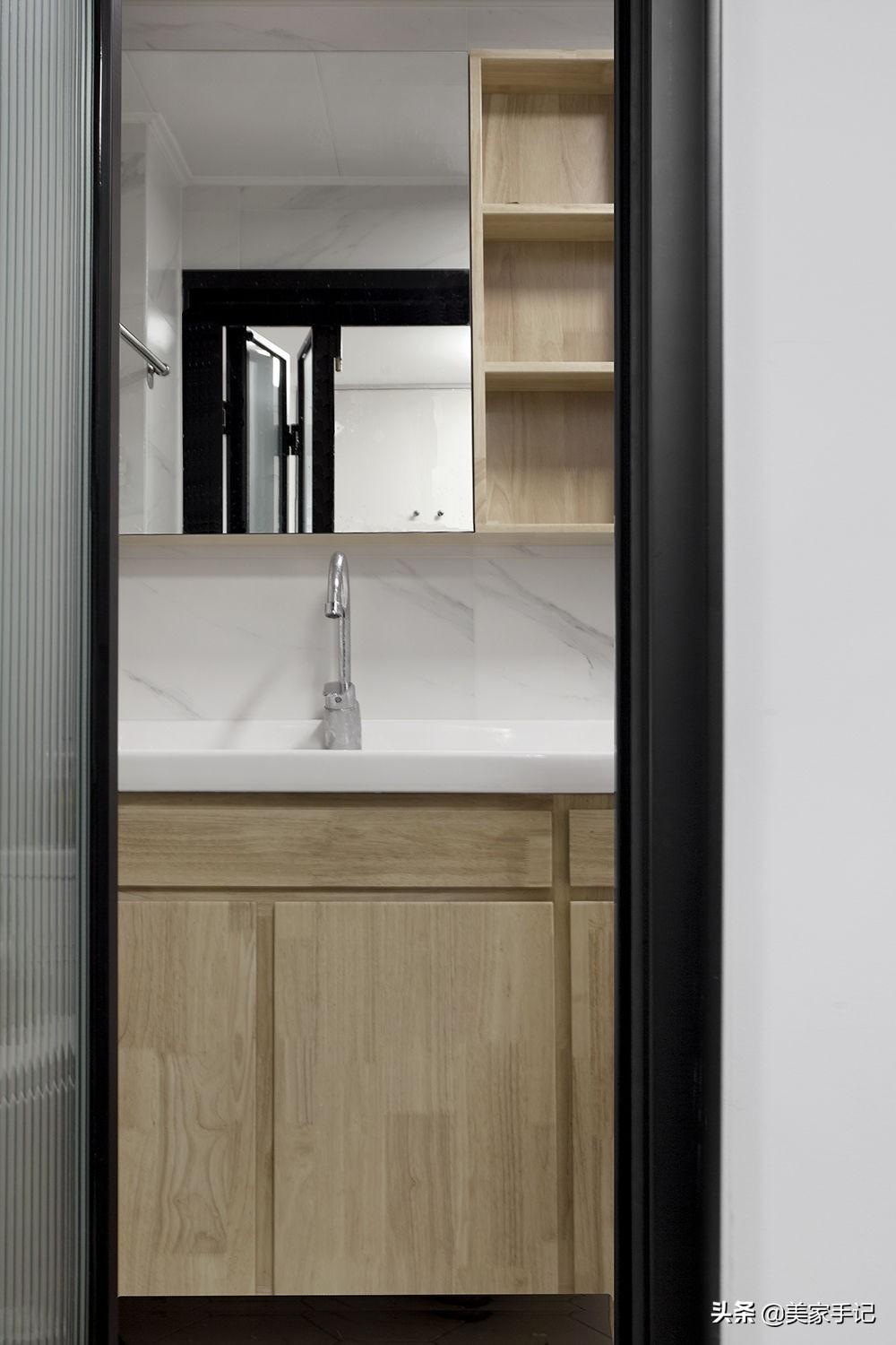 最后是卫生间,位置上与厨房相对,有些人觉得尴尬,事实上,对着的只是干区的洗漱台,其它则用长虹玻璃门作为缓冲隔断。