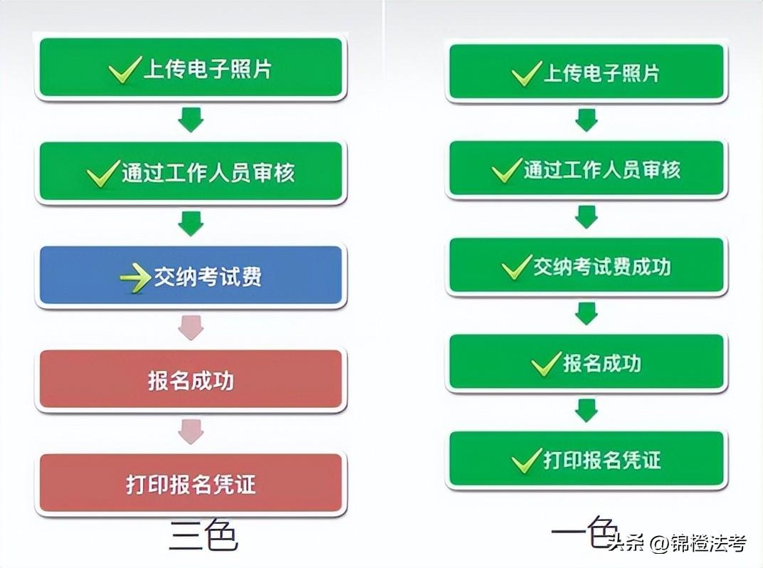 “三色论”:自从2018年法考改革以后,很多考生发现一个“规律”:登录后,报名页面流程显示为“全绿”则没有通过。如果报名页面流程为“绿蓝红”三种颜色则表示通过。这就是著名的“三色论”!