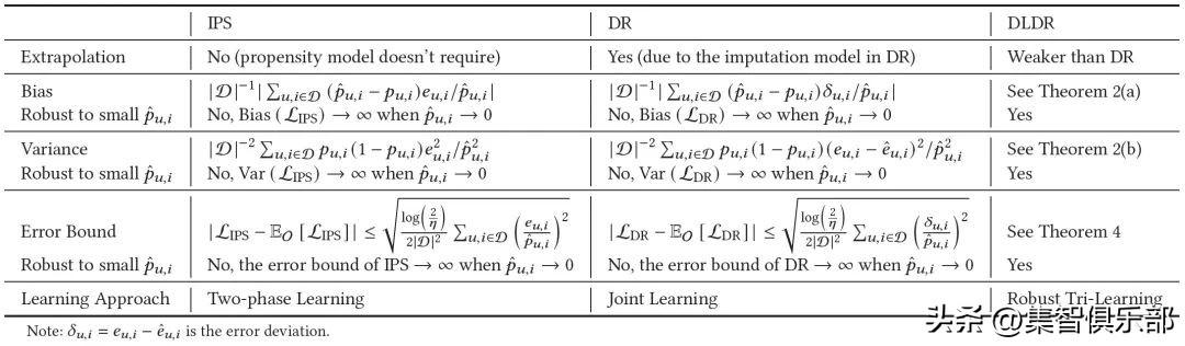 【比较IPS、DR和提出的DLDR估计器的外推依赖性、偏差、方差、误差界和学习方法】