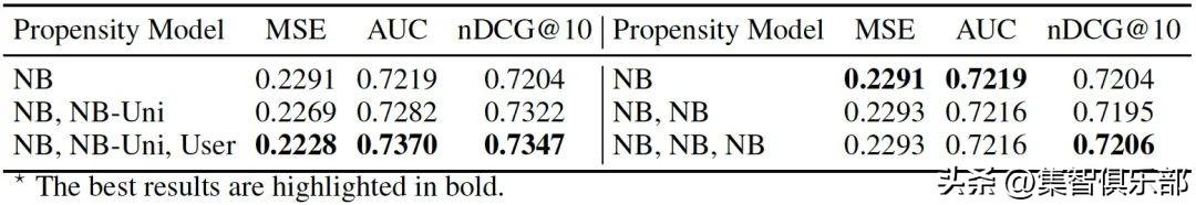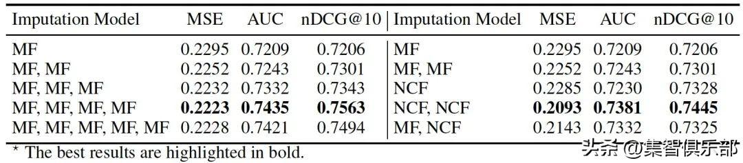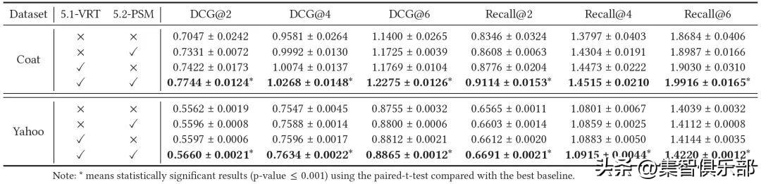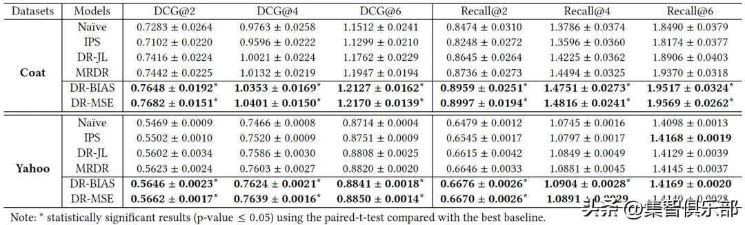 【在Coat和Yahoo!R3的MAR数据上,以MF为基模型,DCG@2,4,6和Recall@2,4,6的评价指标(最好的结果用黑体表示)】