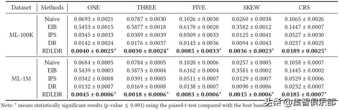 【在两个半合成数据集ML-100K和ML-1M上,五个预测指标的相对误差与理想损失相比较(最好的结果用黑体表示)】