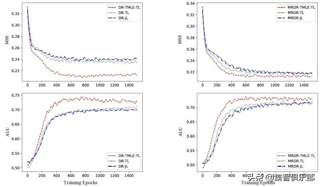 图题:TMLE-TL、TL和JL的MSE(上)和AUC(下)的比较,DR(左)和MRDR(右)作为误差推断模型,其中TL跳过了TMLE-TL中的目标步骤