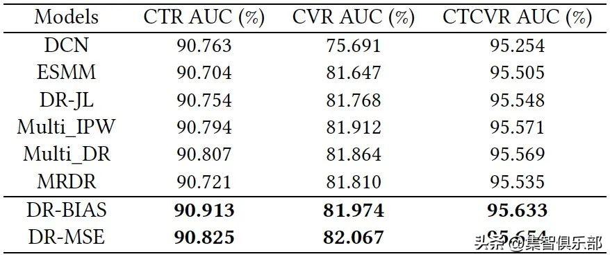 对于考虑选择偏差的CVR的无偏估计器:基于误差推断(EIB)和逆概率加权(IPS)是CVR预测去偏的两个主要策略。此外,可以通过结合EIB和IPS方法构建双稳健(DR)估计器。一个DR估计器将具有双稳健的特性,如果推断误差或倾向性得分都是准确的,它可以保证对CVR的无偏估计。与EIB和IPS方法相比,DR方法在总体上有更好的表现。