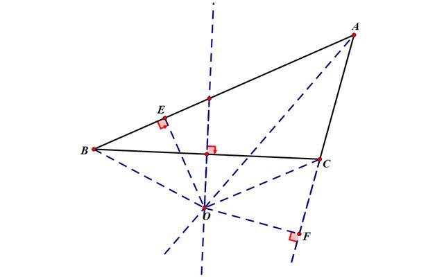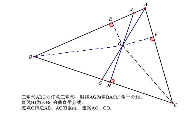 首先,做一个任意三角形。如上图,∠BAC的角平分线AG与三角形BC边的垂直平分线HJ交于O点。过O点分别做边AB、AC的垂线,E、F为垂足。连接BO、CO.