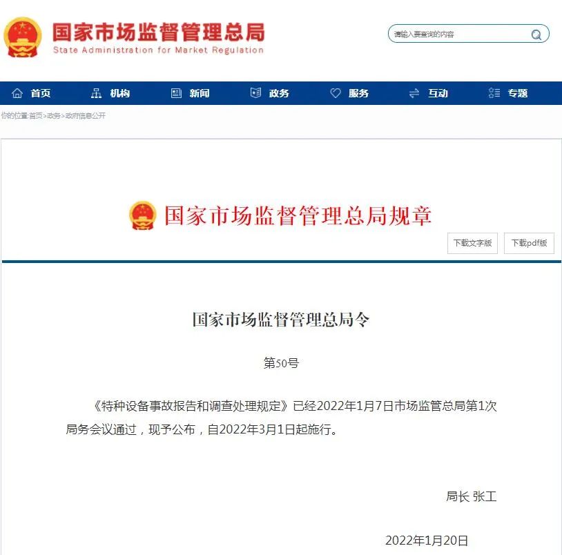 近日,国家市场监督管理总局发布《特种设备事故报告和调查处理规定》,3月1日起施行。
