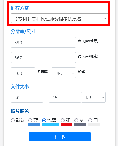 3、在推荐方案中直接选择【专利代理师资格考试报名】,照片规格就自动设置好了,不要随意修改