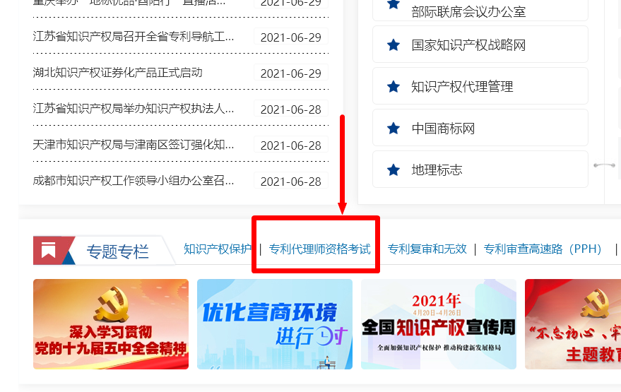 登录国家知识产权局网站,滚动到页面底部,在“专题专栏”中点击“专利代理师资格考试”: