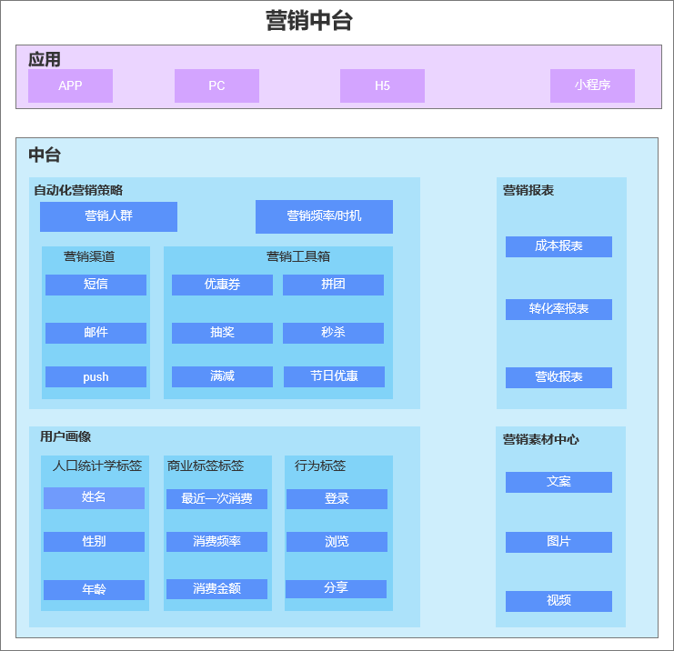 笔者认为营销平台应该是全平台、数字化、精准化、智能化的。而能实现全平台、数字化、精准化、智能化的营销平台需要包括用户画像、营销素材中心、自动化营销策略中心、营销报表这四个模块。