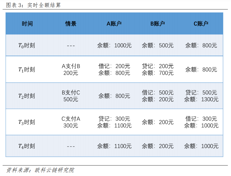 对于实时全额计算而言,我们需要对每一笔支付单独进行计算,得出清算数据,随后进入结算环节,实时进行结算,完成资金划拨,这整个流程称为实时全额结算(RTGS)。例如在T1时刻,A向B支付了200元后,我们得出“A账户余额减少200元,B账户余额增加200元,双方账户的余额在支付后分别为800元和700元”的结果,并随后进入结算环节,借记A账户200元,贷记B账户200元,完成资金划拨,在T1时刻,A查询自己的账户,会发现减少了200元,只剩下800元;剩余的T2,T3时刻也照此计算并完成结算。