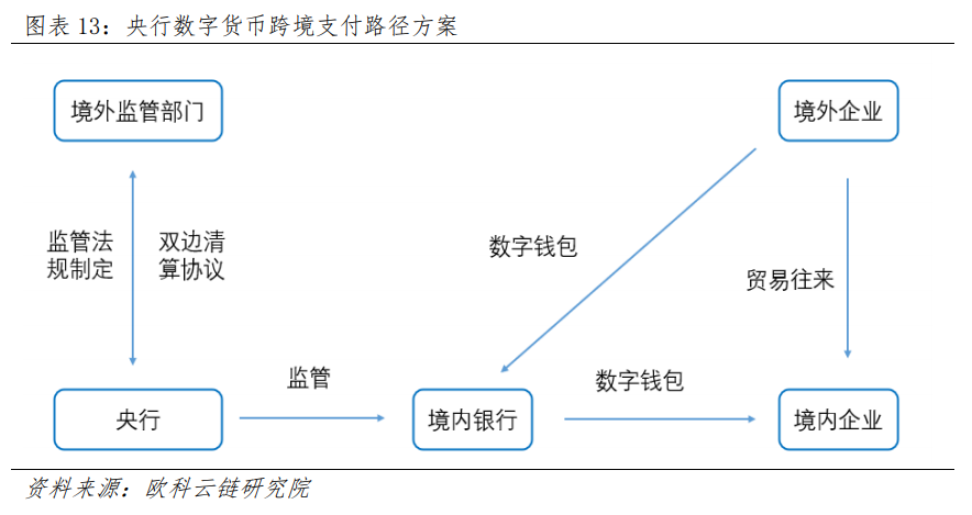 有所不同的是,在央行数字货币的语境下,没有账户的概念,而是只有数字钱包的概念。以DC/EP为例,由于DC/EP采用“双层运营体系”,因此境外企业可以注册安装由境内银行开发的央行数字货币钱包,当需要进行跨境支付时,由境内银行提供运营服务,直接将资金转入对方钱包,而央行负责日常监管。同时,为了防止资金通过该体系外流,可以设置额度管理。当然,在此条件下,如果境内外企业不通过SWIFT进行资金归集和集中调拨等跨境支付以及账单收取,那么将摆脱对SWIFT的依赖。