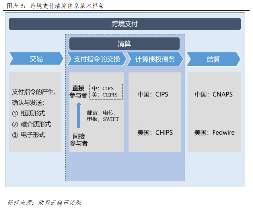 为了让大家有一个国际清算体系的大体轮廓,这里先提供一个基本框架。目前国际清算体系由两大部分组成:一是各国主导的本国货币的跨境清算系统,如美国的CHIPS(美元跨境清算系统)和我国的CIPS(人民币跨境支付系统),二是各国统一共享的国际电讯系统,如SWIFT。在实际运行中,SWIFT与各国的跨境清算系统相连,才能实现跨境支付。以美国为例,美元的跨境支付结算,需要SWIFT同CHIPS,以及美国另一支付系统Fedwire(美元大额支付系统)相连。如果银行是跨境清算系统的直接参与者,则直接通过CHIPS系统进行清算;如果银行是CHIPS的间接参与者,首先通过SWIFT向直接参与者发送指令,随后由直接参与者通过CHIPS完成清算,最终Fedwire完成结算。