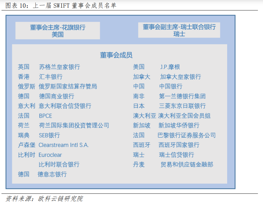 2012年3月SWIFT宣布停止对被欧美制裁的伊朗银行提供服务,让大众意识到SWIFT的重要性同时,也增加了对SWIFT过分依赖的担忧。然而,部分自媒体将SWIFT看成美国政府控制下的一个部门,这是完全错误的。事实上,SWIFT是一个非官方专业组织,其董事会由25位独立董事组成,任期三年。例如在2016年时,董事会由美国花旗银行的董事担任主席、瑞士瑞联银行的董事担任副主席,而来自中国的中国银行、香港的汇丰银行也在其中担任董事会成员。