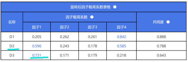 D1~D3共3项,D3出现了‘张冠李戴’问题,应该进行删除处理。D2出现了‘纠缠不清问题’(可对应因子1和因子4),应该给予关注。