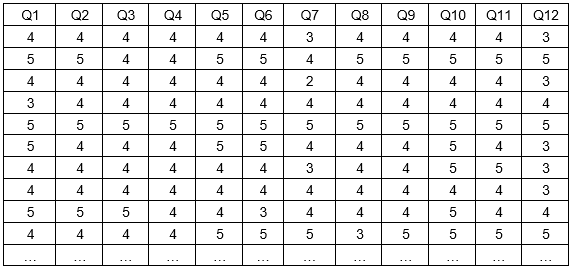 某“教育网站”想要调查用户对于使用、服务等方面的满意度,其中共有12个问题,调研得到259份问卷结果。部分数据如下: