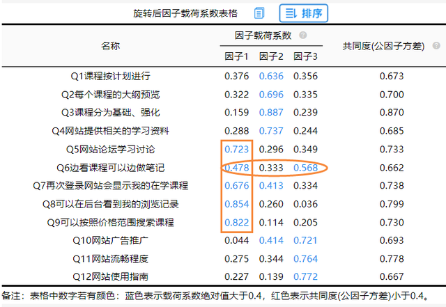 其中Q5-Q9在因子1上有较高的载荷,说明因子1可以解释这几个分析项,它们主要反映了教育网站使用方面的满意度;