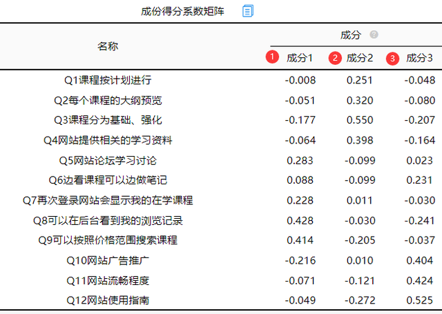 最后确定了提取的因子数及题项对应关系,即可对提取的因子命名。可以结合旋转后的因子载荷矩阵结果进行命名,最终将三个因子分别命名为F1用户体验、F2教学质量、F3网站服务。