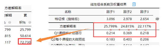 上表格针对因子提取情况,以及因子提取信息量情况进行分析,从上表可知:因子分析一共提取出3个因子,此3个因子旋转后的方差解释率分别是25.799%,24.815%,22.117%,旋转后累积方差解释率为72.730%。