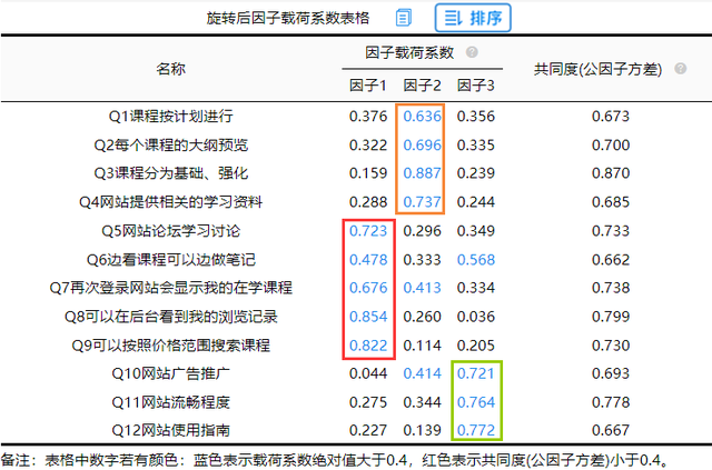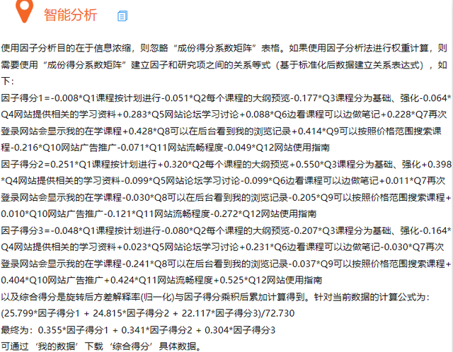 通过分析我们知道案例数据满足因子分析条件,并且由因子提取个数可以看出三个因子涵盖原变量的大部分信息,信息浓缩也较好,以及得到权重的过程。最后确定了提取的因子数及题项对应关系,即可对提取的因子命名。可以结合旋转后的因子载荷矩阵结果进行命名,最终将三个因子分别命名为F1用户体验、F2教学质量、F3网站服务。